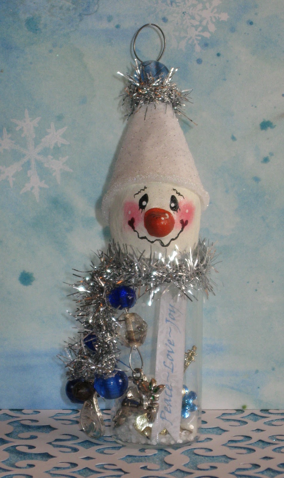 I thought I'd share some Bottle Snowmen that I made for my craft shows. I will be putting them in the craft show next week and if I have any left, they will go on Etsy. They have hand molded clay heads and glass bottle bodies, with glitter, snow, a tag, trinkets inside, plus the tinsel scarf with beads and wrapped on wire are charms & beads also. Each one is different. They stand about 4 inches tall. They can hang, but I prefer them standing, perhaps with a mini bottle brush tree... hmmm, I should have thought of that when I was taking pictures! I am enjoying photographing my items in creative ways, so let me know what you think. I love all the comments/compliments/advice that I get from you. You don't know how much it means to me! Please keep them coming!!